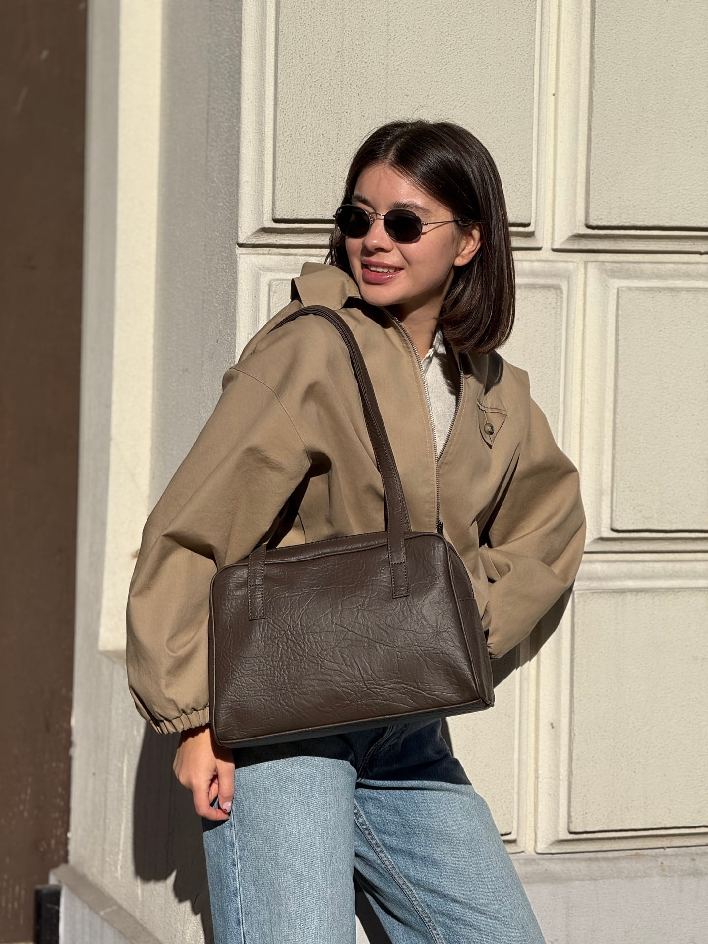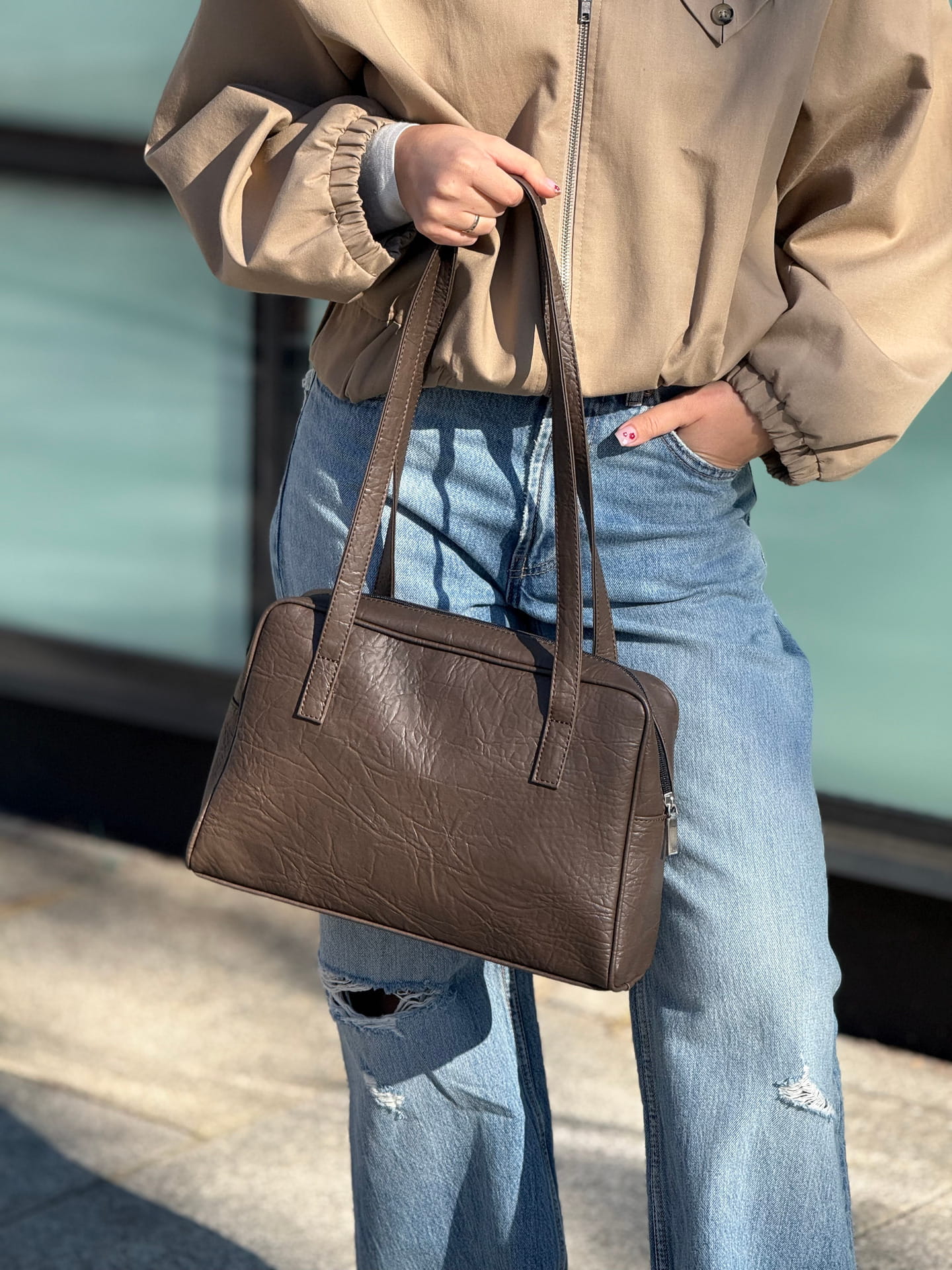 Die Tasche wird mit einem robusten Reißverschluss geschlossen, sodass deine Sachen sicher verstaut sind, und ihre kompakte Form wirkt leicht und sehr stilvoll.