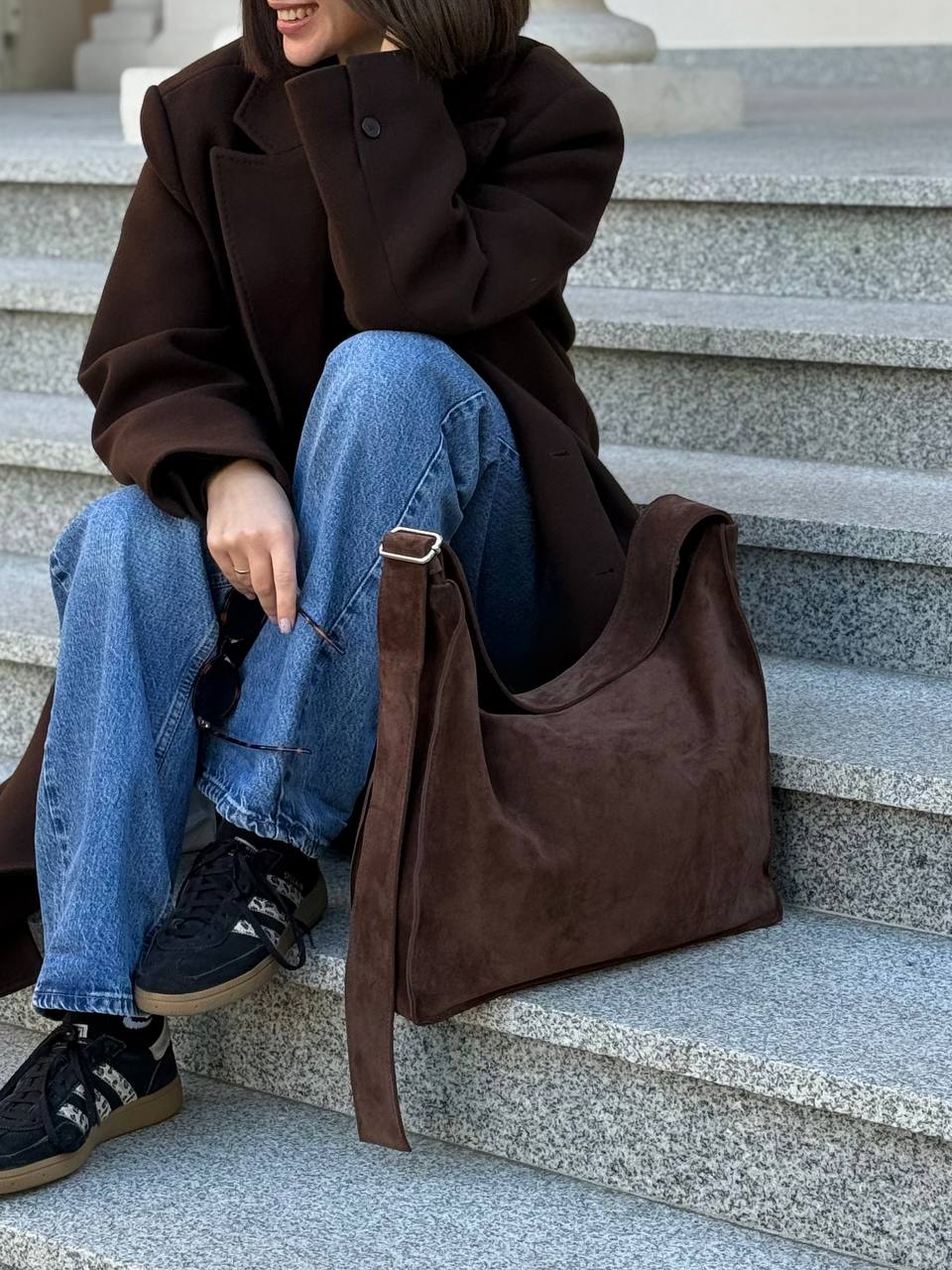 Głęboki, czekoladowy brąz, miękka i luksusowa włoska skóra zamszowa oraz precyzyjne rzemiosło z Radomia – to połączenie, które sprawia, że torba wyróżnia się na tle innych.